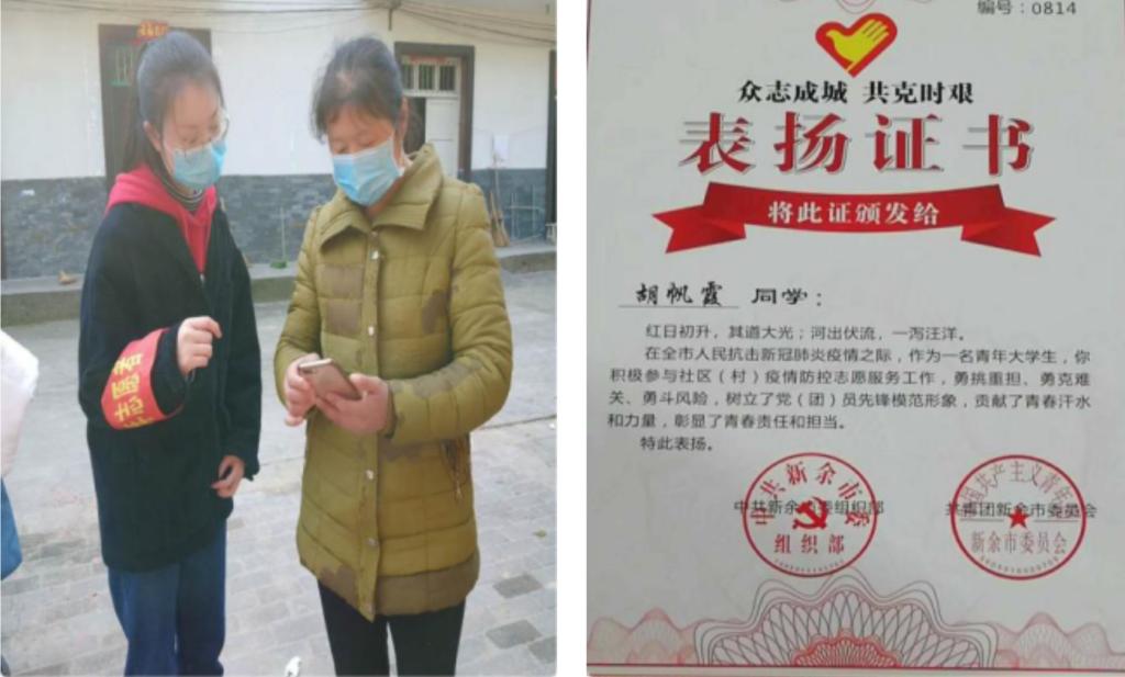 胡帆霞是该院2018级助产专科二班的班长。在得知志愿服务队人员不足时,她自告奋勇的参加志愿服务,积极参与防疫宣传、教授村民戴口罩的正确方法、帮助村民办理电子通行证等。她的优异表现得到了中共新余市委组织部及共青团新余市委员会的一致认可。