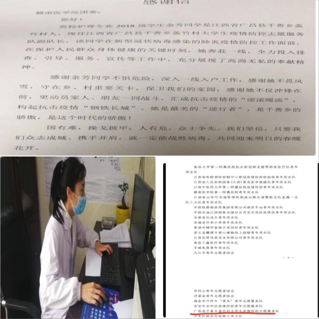 余芳是该院2018级护理学本科三班的学生。新型冠状病毒爆发以后,她便立刻投入了“战斗”,成为广昌县千善乡盖竹村志愿服务队的副队长。该服务队是抚州市唯一一个被共青团江西省委点名表扬的青年集体。余芳同学作为服务队中唯一的医学生,运用所学知识为帮助村民量体温、宣传口罩的正确佩戴方法以及六步洗手法等疫情防控知识。