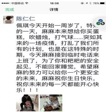 奔赴疫情战地的那一天,是陈仁仁孩子一周岁的生日,但疫情紧急,容不得一刻拖延。临走前,她红着双眼,将宝宝深深拥入怀中:“宝宝生日快乐,请原谅妈妈不能陪伴你度过一周岁生日,因为有更重要的事情要去完成,希望妈妈的努力,能给你一个更安全的未来!”而转身的那一刻,也就意味着,只有当战斗结束时,她才能回家抱抱心爱的女儿......