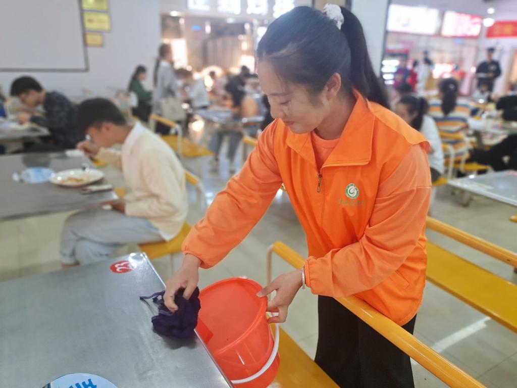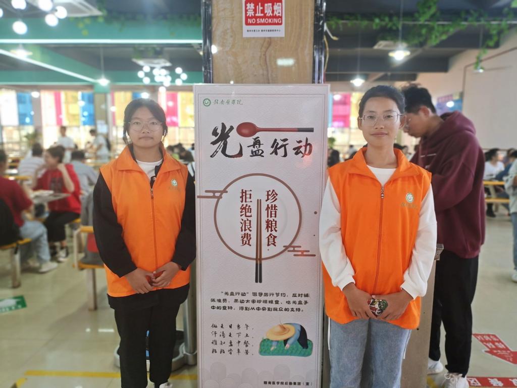 活动过程中,我院召集了志愿者帮助食堂工作人员清理桌上的食物残渣,打扫卫生,为同学们打造良好的就餐环境的同时也警醒大家注意食堂卫生,拒绝浪费;并且在食堂设立学生文明行为督导员,倡导和督促学生节约粮食,践行“光盘”行动。