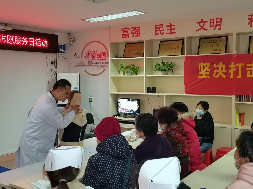 志愿服务活动分为两个阶段。第一阶段为急救知识宣讲。姚宏亮老师为社区居民生动形象的演示了成人及婴儿的心肺复苏操作、海姆立克急救法以及高血压等常见病的应对方法等,并邀请居民亲自在模型上练习。第二阶段为义诊。在社区居委会的带领下,姚老师深入行动不便的老人家里开展义诊。红医班的学生在居委会为居民量血压等进行健康评估。