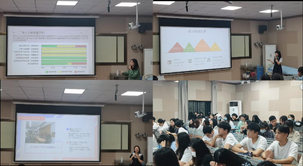 在讲堂的第二部分,学院两位优秀实习生代表,18级护理学本科4班的曾静和19级护理学本科6班的仰海睿分别介绍了她们在南方医院和南昌大学第一附属医院的实习经历。两位同学分别从实习医院选择、实习生活、实习与考研的平衡、实习需要注意的问题等方面分享实习期间的体会与收获,提醒即将实习的学弟学妹们要保持慎独精神,发挥好党员和入党积极分子的模范带头作用,虚心请教,手脚勤快,心系患者,将课堂上所学的理论知识与临床实践相结合。