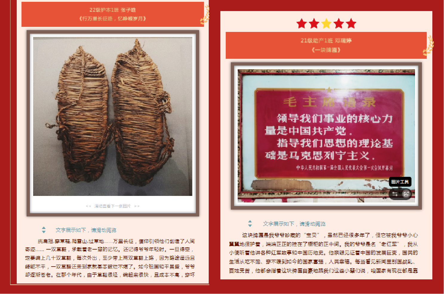 在波澜壮阔的历史进程中,留下了许多承载着珍贵记忆的红色老物件,它们承载着可歌可泣的英雄史诗,镌刻着革命英烈的奋斗足迹。一个个红色物件不仅是我们回顾历史的载体,更是一堂堂生动鲜活的“微党课”。为致敬中华人民共和国建国75周年的伟大征程,由护理学院党委主办,学生党建工作站承办的“寻找身边的红色物件”征集活动得到了全院学子的广泛参与。