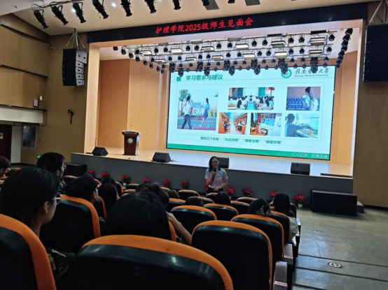 9月28日,护理学院党委书记丁梅以《白衣素行 暗香独秀》为题,在龙南校区为2025级本科新生讲授“开学第一课”。