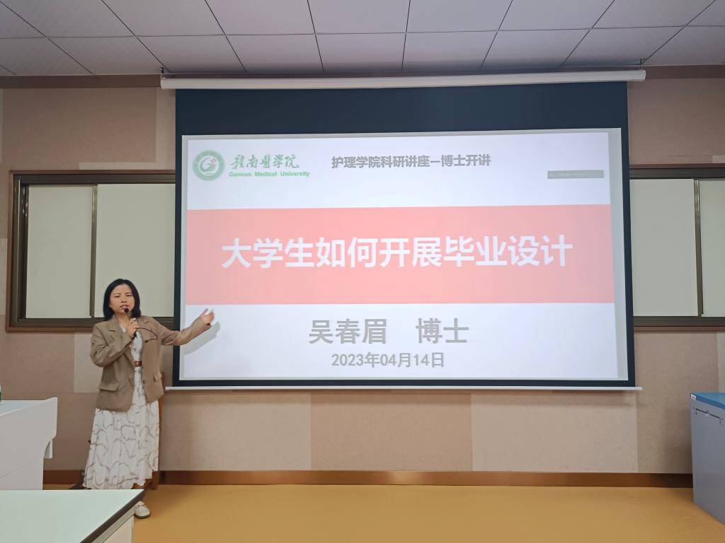4月14日,护理学院在章贡校区开展博士开讲活动。公共卫生与健康管理学院卫生统计学教研室吴春眉博士以“大学生如何开展毕业设计”为题作科研讲座。该院副院长孟利敏、教师及学生100余人到场聆听。