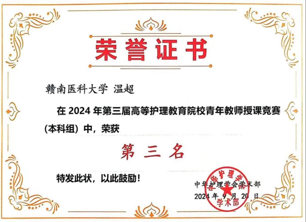 我校护理学院的温超老师在此次竞赛中表现出色,凭借扎实的专业知识和出色的授课能力,最终荣获第三名。这一成绩不仅展现了温老师个人的努力与才华,也体现了该院在培养青年教师方面的卓越成果。