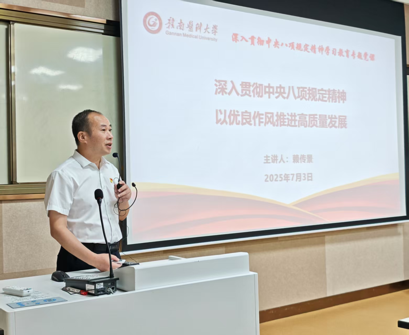 7月3日,学校党委常委、统战部部长赖传景以《深入贯彻中央八项规定精神,以优良作风推进高质量发展》为题,为护理学院全体党员讲授专题党课。