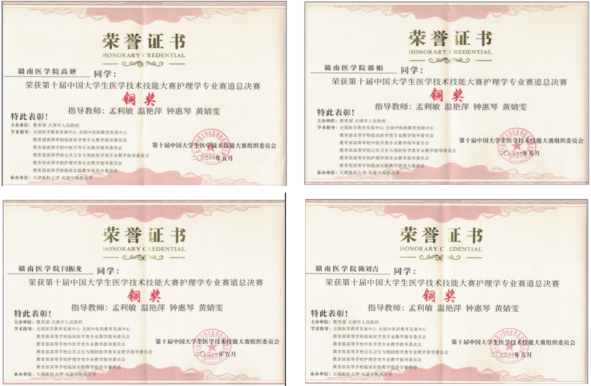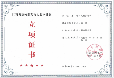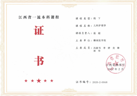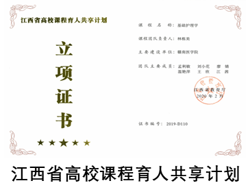 《急危重症护理学》于2014年被评为校级精品课程,2016年被评为校级重点扶持学科。2017年被评为精品在线课程。2020年获课程思政“示范课程”立项。2021年评为江西省线下一流课程和育人共享计划课程。同年获学校立项国家级一流课程培育项目。