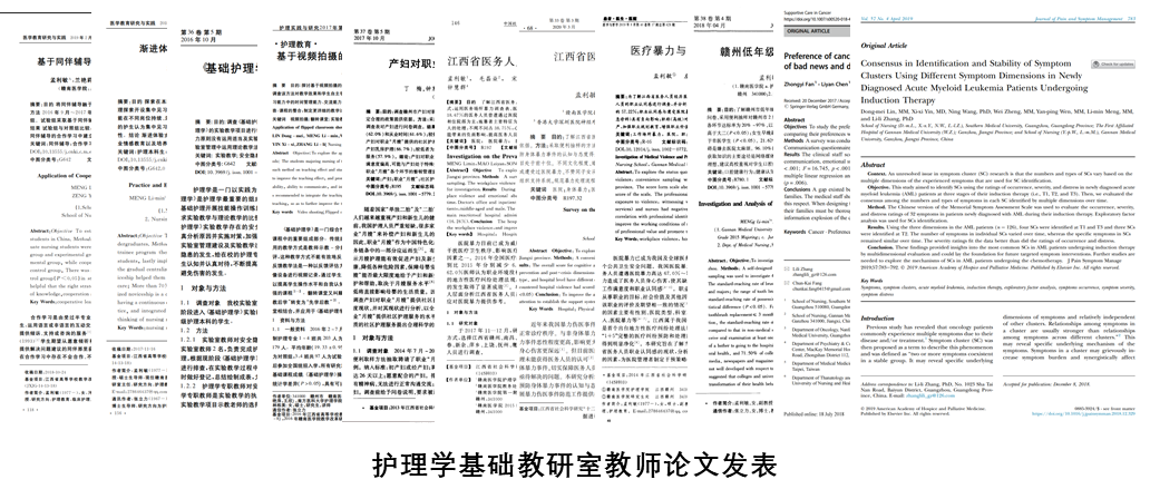 实验室管理人员目前共5人,其中副教授1人,副主任护师2人,初级职称2人。中心实验室2019年获“三育人”先进集体,主持省部级在研课题2项,参与完成省部级课题2项,主持完成市厅级及校级课题5项;撰写CPCI-SSH收录论文2篇、省级刊物7篇、参编教材6部,其中副主编3部;指导本科生参加江西省2020年“挑战杯”大赛荣获铜奖。