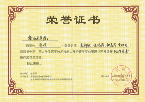 2021年,学生在第十届中国大学生医学技术技能大赛护理专业赛道荣获团体三等奖,华东赛区一等奖。